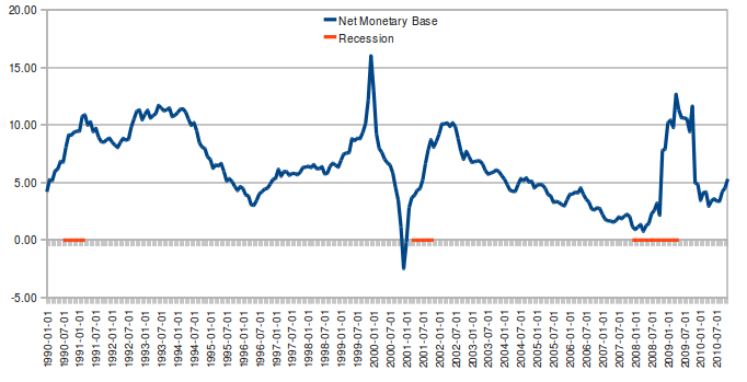 Oh well so much for that theory I suppose. Look those four recessions in the 1970s and early 1980s - obviously the money supply was increasing before and after these recessions. If we connect the above graph with the 1990-2010 one we'll even see that while the increase in the money supply drops in the late 1980s, it is still increasing when the early 1990s recession hits. So it appears as though the experience of a contracting money supply causing a recession is only applicable to the last two recessions. Or is it?